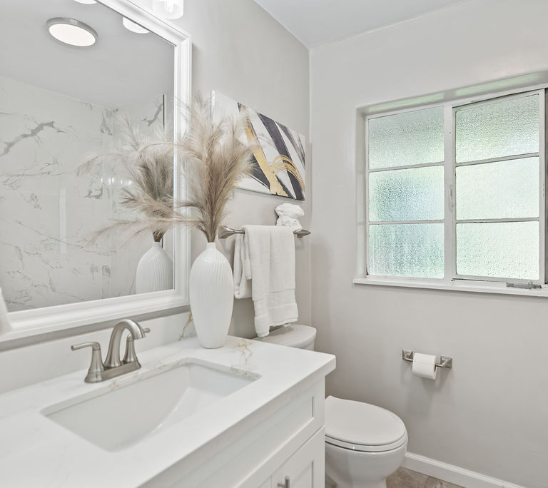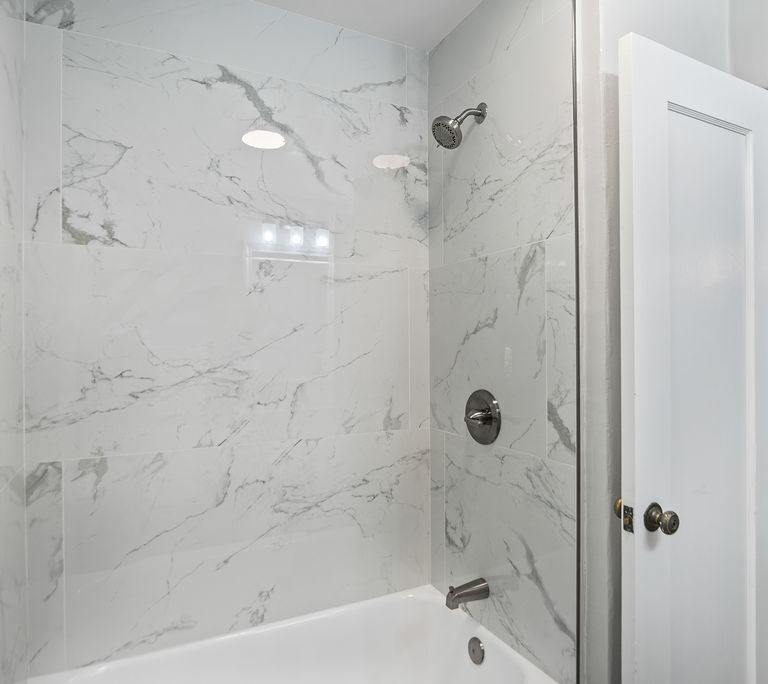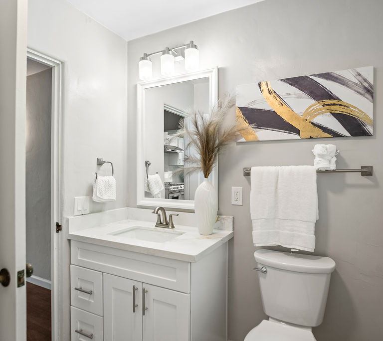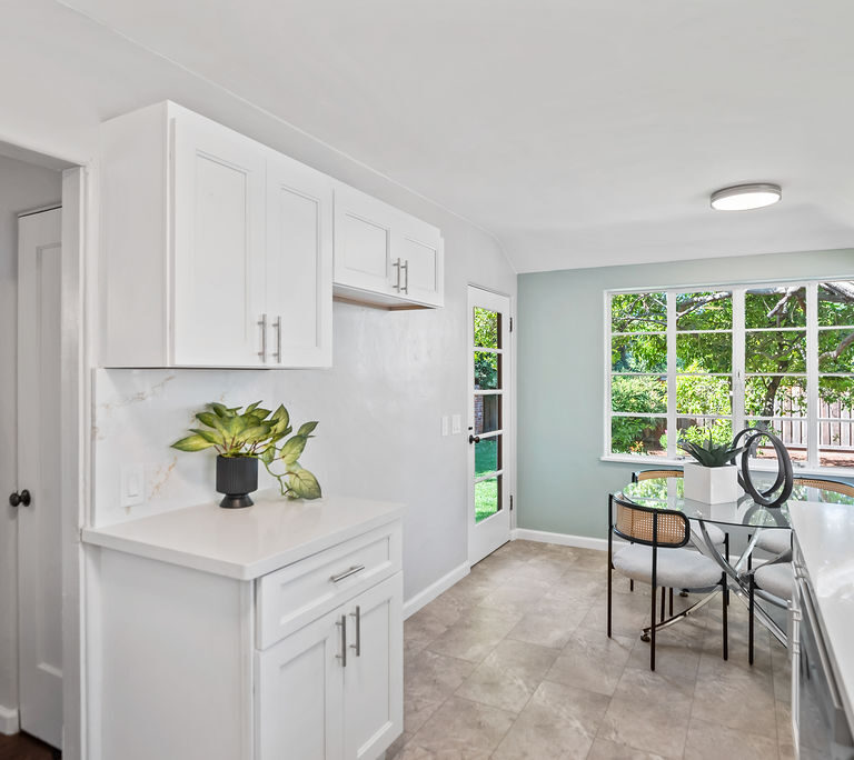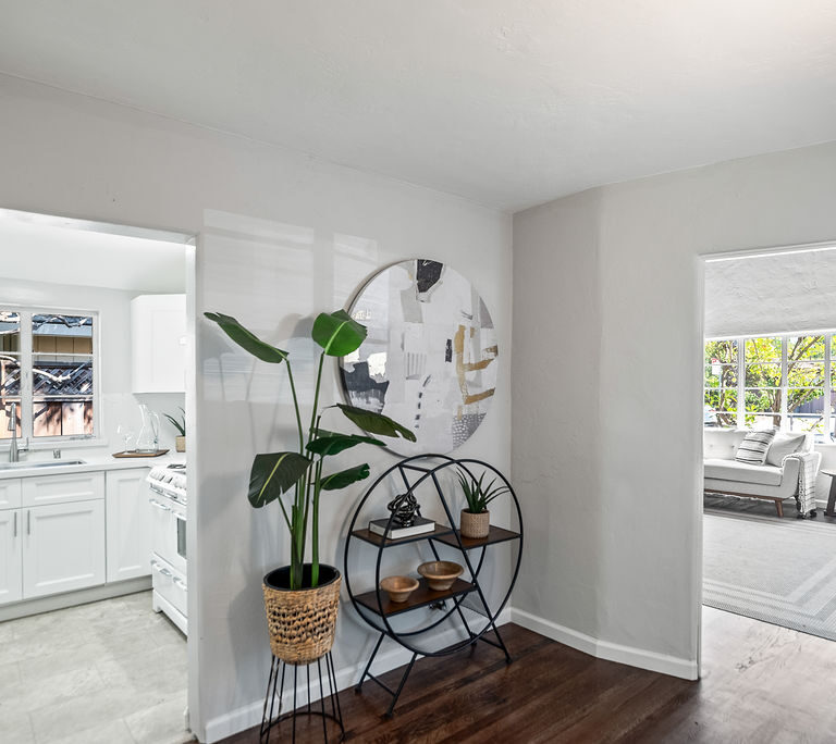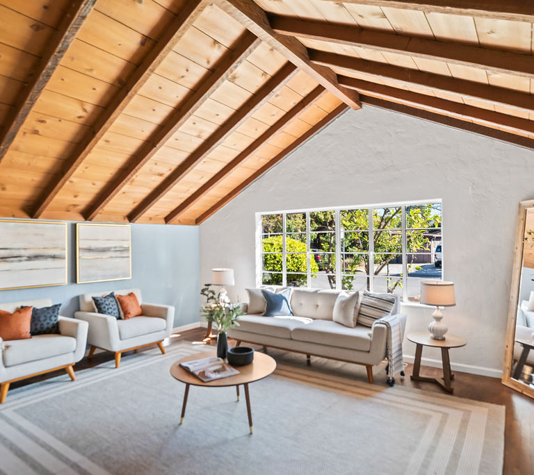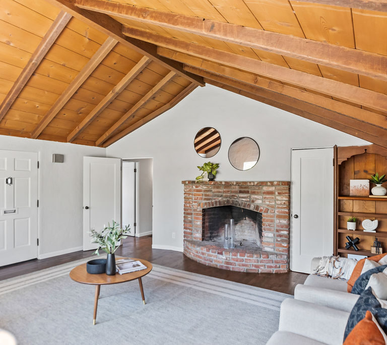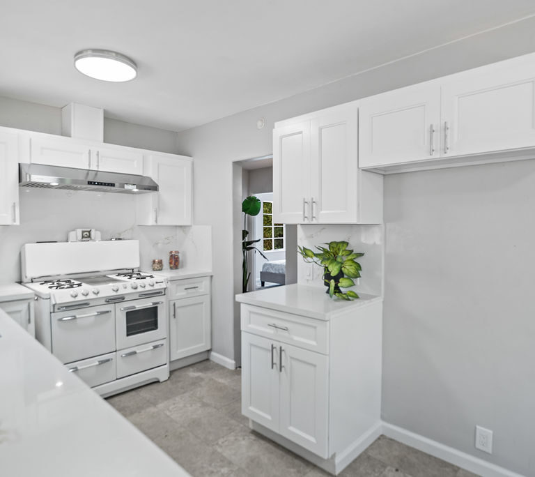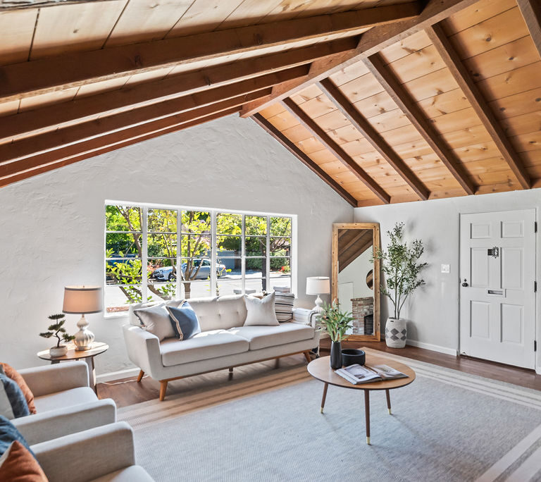 The living room feels light and welcoming beneath striking vaulted wood ceilings. Wonderful chef’s kitchen with white shaker cabinets, quartz counters and backsplash, corner window, and vintage stove/oven combo with tons of character. Refinished hardwood floors extend through the living room, hallway, and bedrooms. Tasteful wood accents such as built-in shelves and exposed beams enhance the cozy aesthetic.