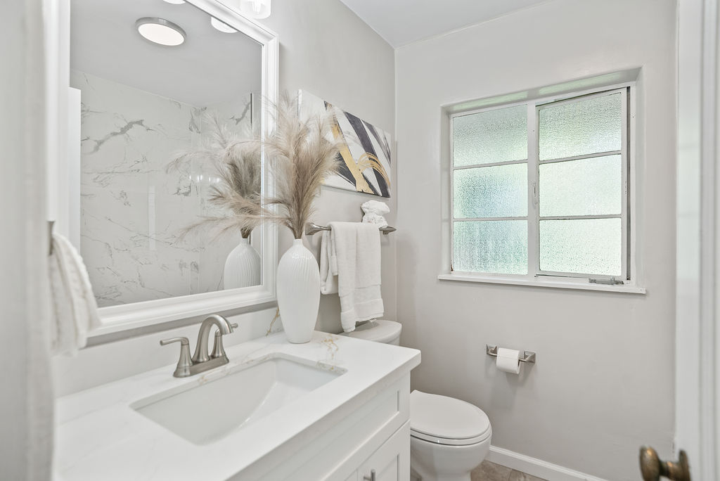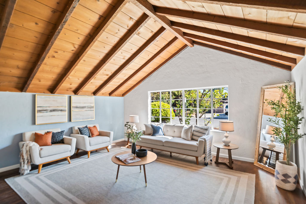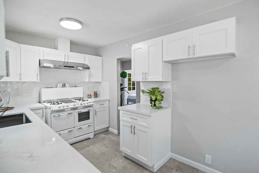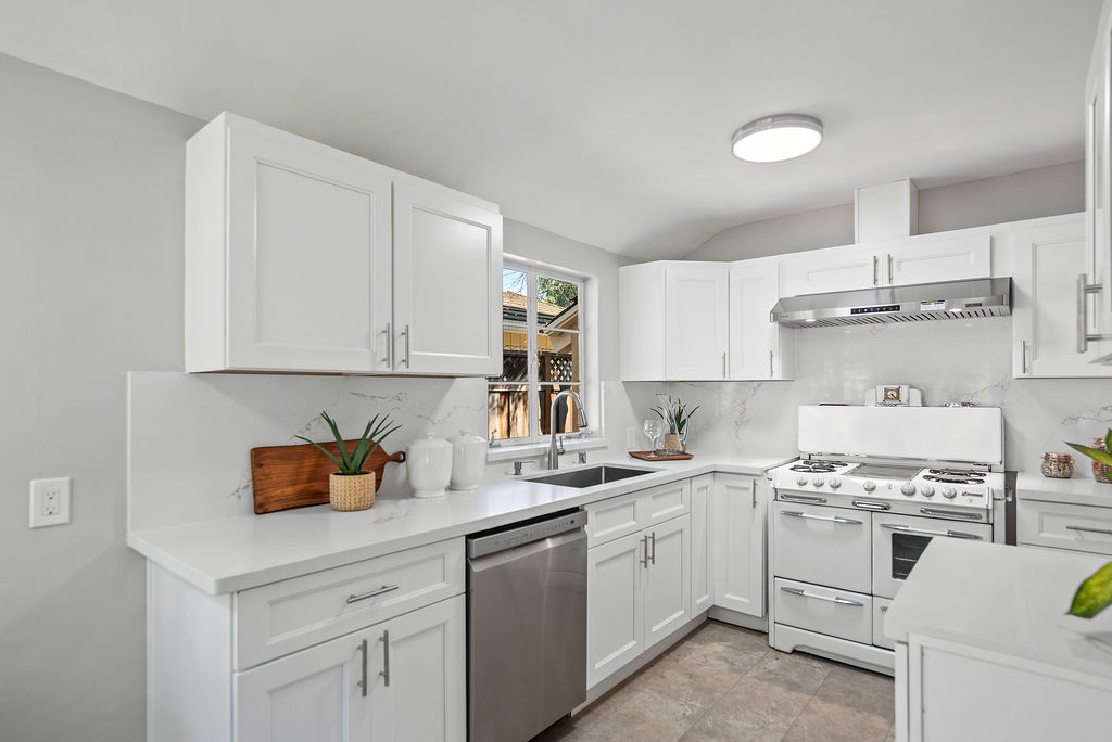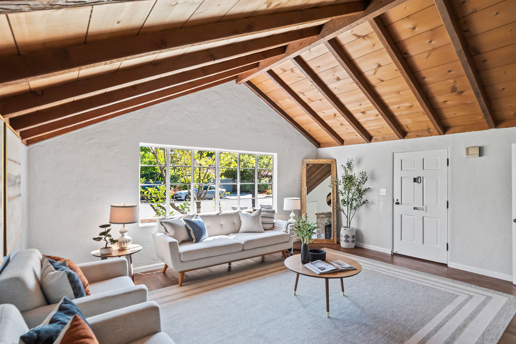 The living room feels light and welcoming beneath striking vaulted wood ceilings. Wonderful chef’s kitchen with white shaker cabinets, quartz counters and backsplash, corner window, and vintage stove/oven combo with tons of character. Refinished hardwood floors extend through the living room, hallway, and bedrooms. Tasteful wood accents such as built-in shelves and exposed beams enhance the cozy aesthetic.